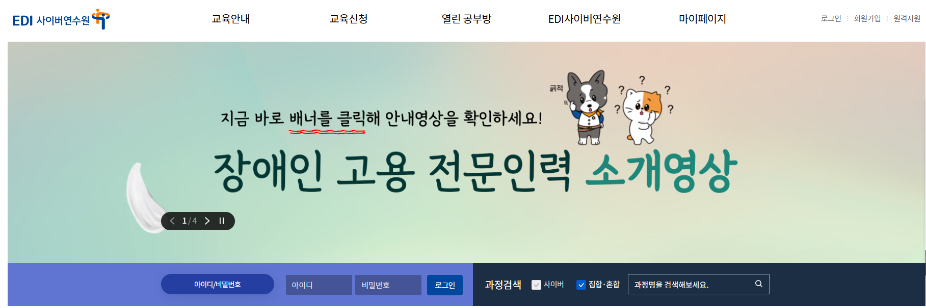 EDI 사이버 연수원은 장애인 고용 문화 확산과 전문 인력 양성을 지원하기 위한 교육 플랫폼으로 다양한 온라인 교육 서비스를 제공하는 사이트입니다.