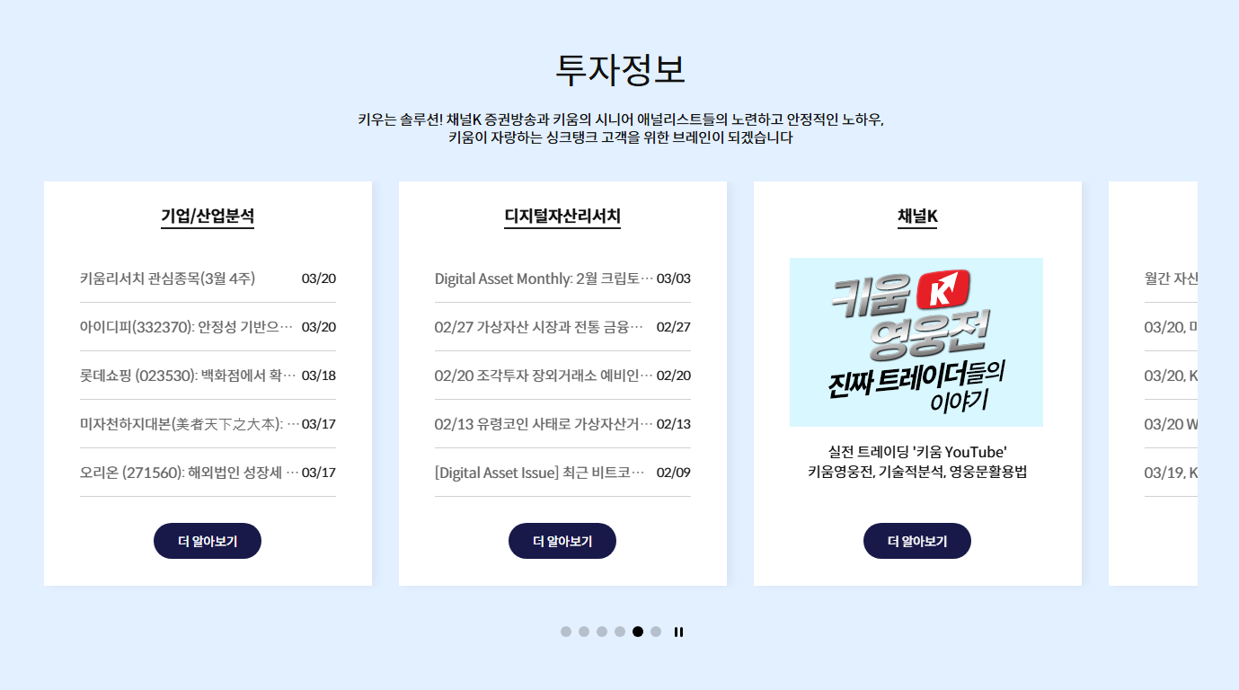 키움증권 홈페이지에서는 다양한 투자 정보와 리서치 자료도 제공됩니다. 경제 분석과 기업 분석, 시장 전망 등 다양한 콘텐츠를 확인할 수 있습니다. 대표적으로 제공되는 정보는 다음과 같습니다.